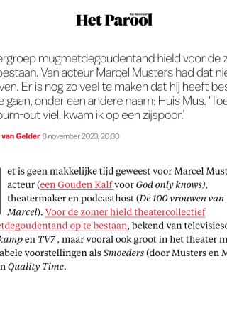 Het is geen makkelijke tijd geweest voor Marcel Musters, acteur (een Gouden Kalf voor God only knows), theatermaker en podcasthost (De 100 vrouwen van Marcel). Voor de zomer hield theatercollectief mugmetdegoudentand op te bestaan, bekend van televisieserie Hertenkamp en TV7 , maar vooral ook groot in het theater met memorabele voorstellingen als Smoeders (door Musters en Maria Goos) en Quality Time.