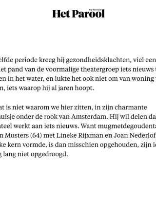 Maar dat is niet waarom we hier zitten, in zijn charmante zomerhuisje onder de rook van Amsterdam. Hij wil delen dat hij momenteel werkt aan iets nieuws. Want mugmetdegoudentand, waarvan Musters (64) met Lineke Rijxman en Joan Nederlof de artistieke kern vormde, is dan misschien opgehouden, zijn ideeën zijn nog lang niet opgedroogd.