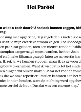 “Ik heb de mug mee opgericht, 38 jaar geleden. Omdat ik dacht, dan kan ik altijd mijn creatieve stroom volgen. Tot ik doodga, zeg maar. Een paar jaar geleden, toen een nieuwe ronde subsidie voor het kunstenplan aangevraagd moest worden, hebben Joan Nederlof en Lineke Rijxman gezegd: laten we na veertig jaar stoppen. Ik zei, ja, we kunnen stoppen, maar ik ga gewoon door. Ik wil het gebouw overnemen. Want ik wist dat ik tot het einde van mijn leven dingen wil blijven maken. Maar net voor de zomer hoorde ik dat we onze repetitieruimte en kantoren aan het WG-terrein niet konden houden, want de stichting werd opgeheven, en daarmee verviel de huur. Dus dat was een enorme klap.”