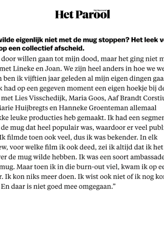 “Ik had door willen gaan tot mijn dood, maar het ging niet meer samen met Lineke en Joan. We zijn heel anders in hoe we werken. Daarom ben ik vijftien jaar geleden al mijn eigen dingen gaan doen. Ik had op een gegeven moment een eigen hoekje bij de mug, waar ik met Lies Visschedijk, Maria Goos, Aaf Brandt Corstius, Marc-Marie Huijbregts en Hanneke Groenteman allemaal hartstikke leuke producties heb gemaakt. Ik had een segment binnen de mug dat heel populair was, waardoor er veel publiek kwam. Ik filmde toen ook veel, dus ik was bekender. In elk interview, voor welke film ik ook deed, zei ik altijd dat ik het ook even over de mug wilde hebben. Ik was een soort ambassadeur van de mug. Maar toen ik in die burn-out viel, kwam ik op een zijspoor. Ik kon niks meer doen. Ik wist ook niet of ik nog kon spelen. En daar is niet goed mee omgegaan.”