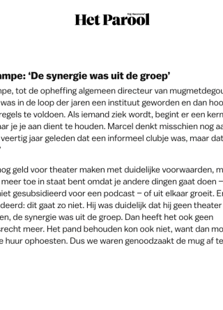 Ooit begonnen als een collectief van theatermakers en acteurs, was de mug al jaren een vaste waarde in het theaterlandschap. In de loop der tijd veranderde de samenstelling, maar de laatste jaren bestond de kern uit Musters, Nederlof en Rijxman, al gingen de drie de laatste tijd ook steeds meer hun eigen weg. Dat was een van de redenen om te stoppen als theatercollectief. Terwijl Nederlof artistiek directeur was en vooral toneelstukken schreef en Rijxman vooral maakte en speelde, was acteren voor Musters te zwaar geworden na een hevige burn-out. Tegelijkertijd boekte hij wel succes met zijn podcast De 100 vrouwen van Marcel, waarvoor hij diepte-interviews houdt met vrouwen die hem hebben geraakt in zijn leven: bekende namen als Hedy d’Ancona, Carice van Houten, Lucretia van der Vloot en Maryam Hassouni schoven al aan.